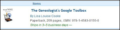 A few days ago I noticed that there was a new book for genealogists on the market. Lisa Louise Cooke in her blog post this morning reminded readers about The Genealogist's Google Toolbox her new book "with all the best free state-of-the-art Internet tools I could find from the folks who dominate the online world: Google."