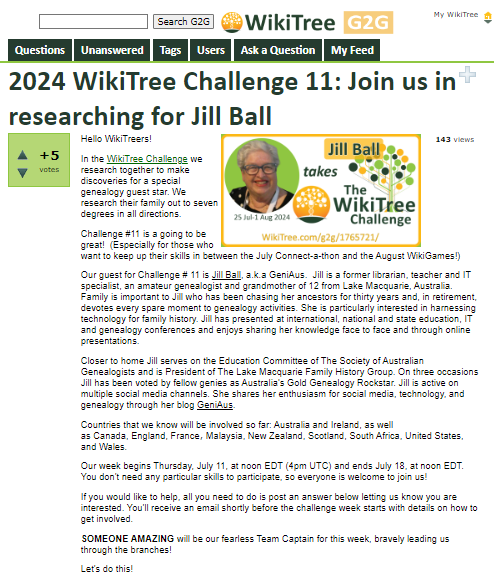 As the event, The 2024 WikiTree Challenge 11, will be launched on zoom at 2am tomorrow (my time in Australia). My immediate issue is do I go to bed early and set an alarm for 1:30ish or do I try and stay awake? I'll see how my day pans out.